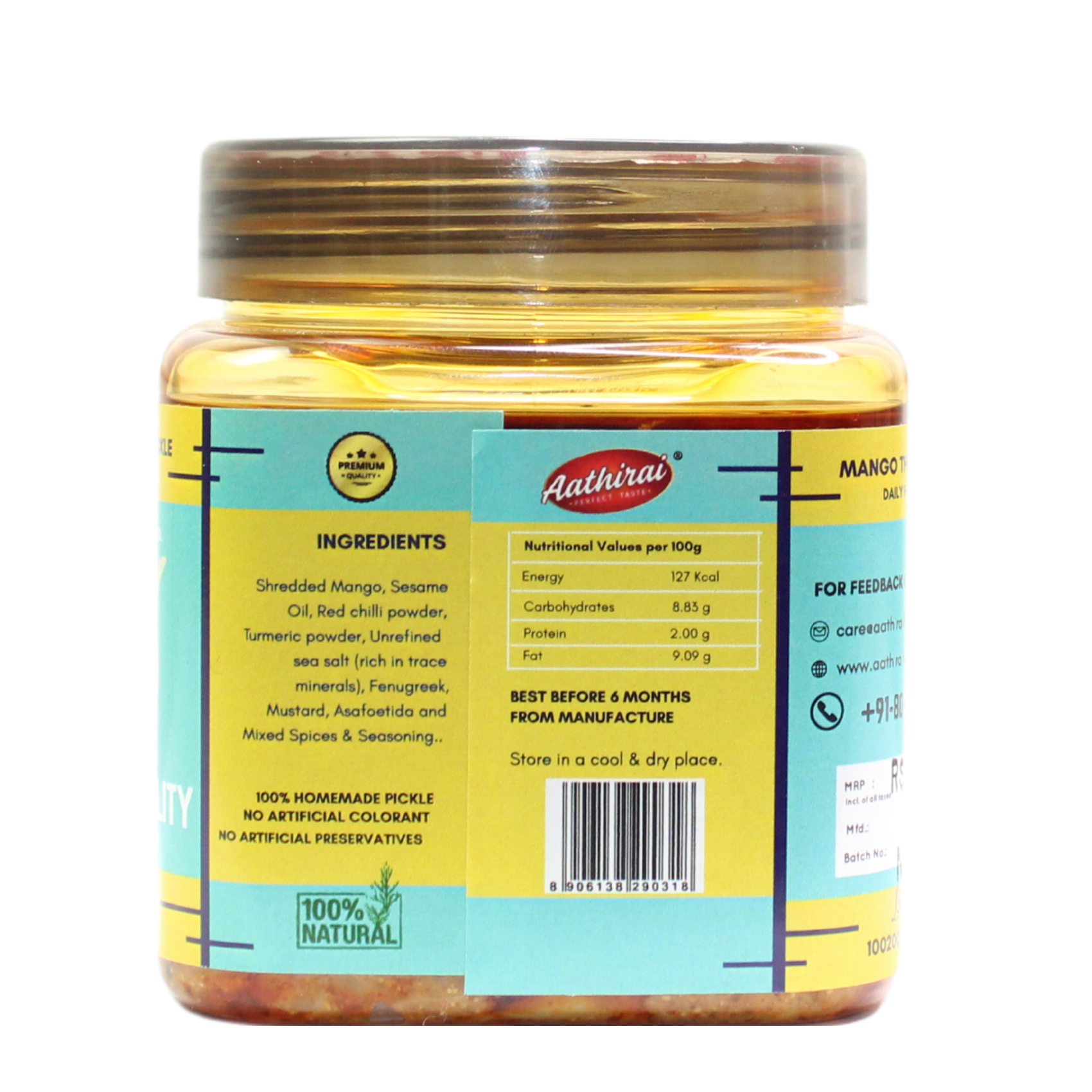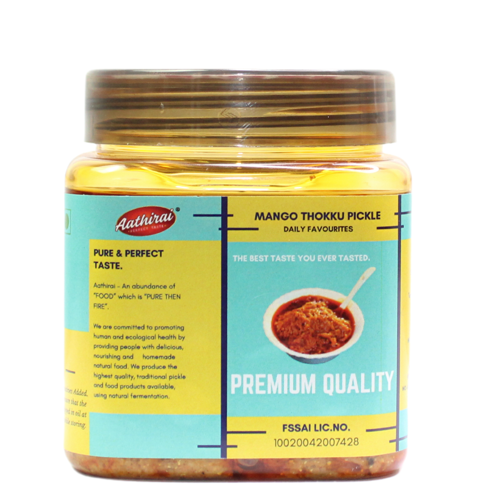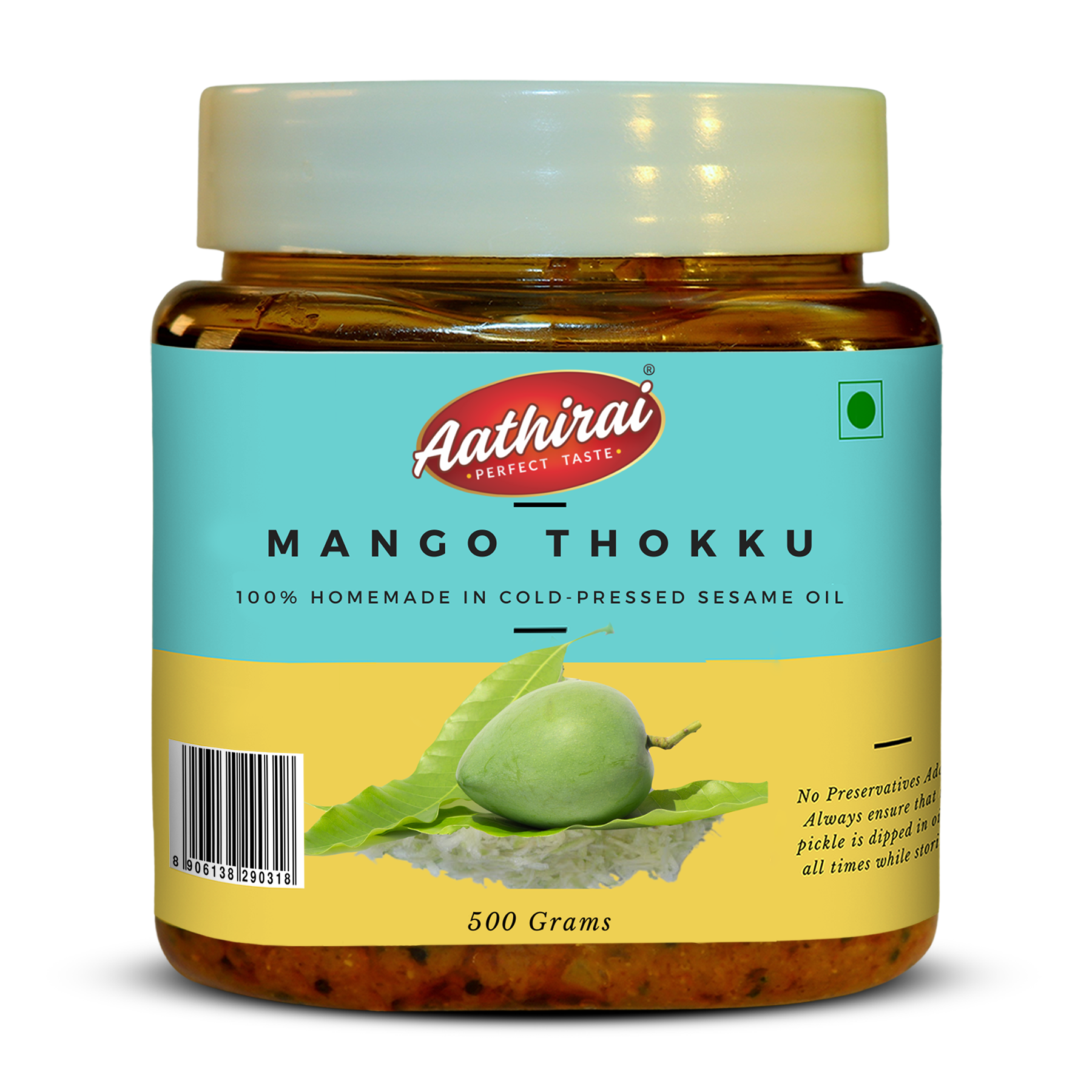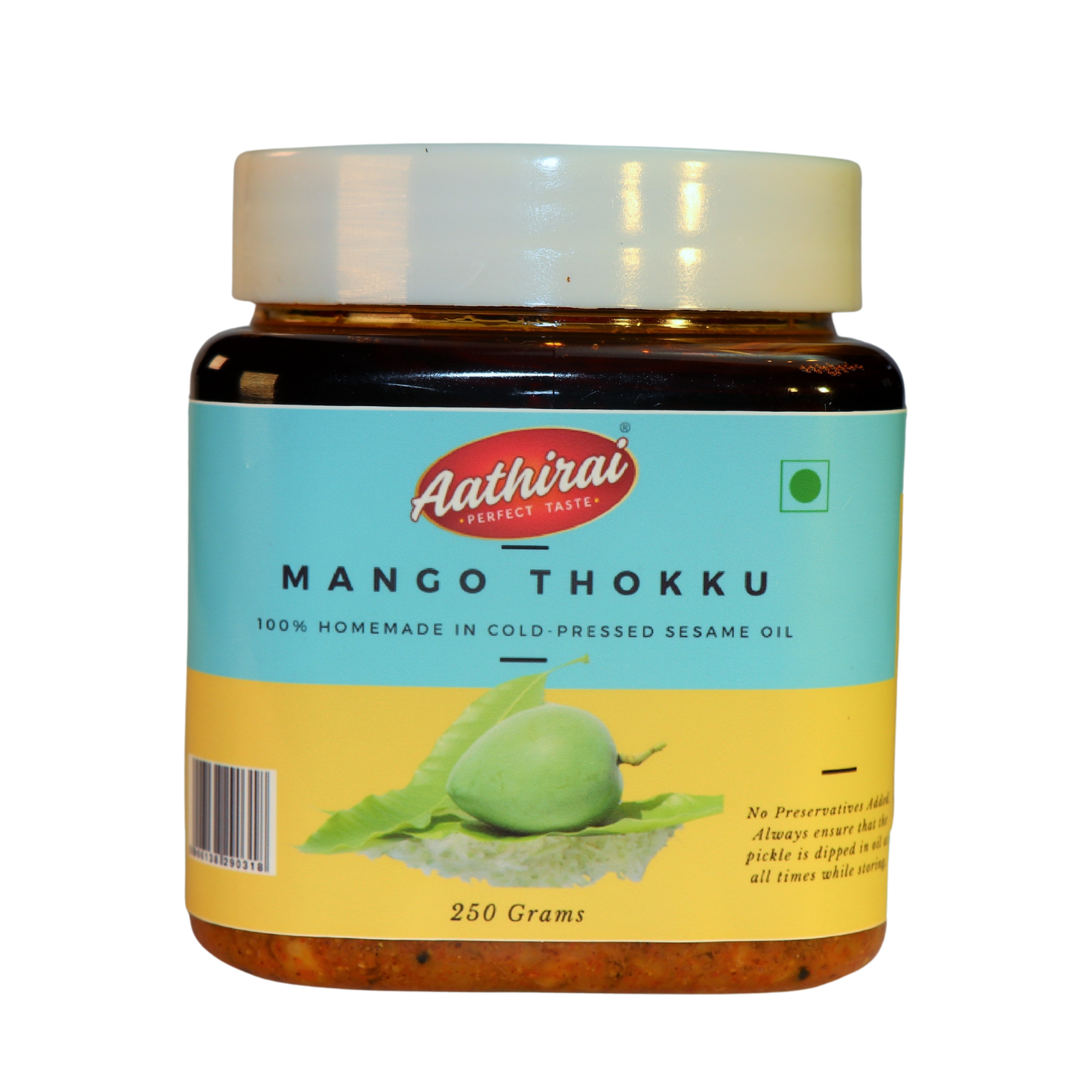 The finest South Indian Mango thokku prepared by grating sour and fresh mangoes. This is a simple-looking yet tasty variety of pickles. This tangy chutney-like condiment goes well with hot rice, rotis, even idli and dosa. Mango thokku is a delight for any of your meals, a union of rich tradition and authentic taste.